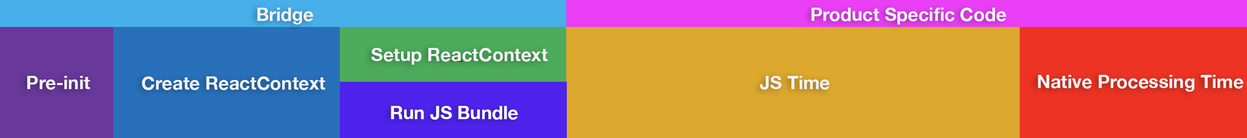 We first initialize the React Native core (aka the “Bridge”) before running the product specific JavaScript which determines what native views React Native will render in the Native Processing Time.