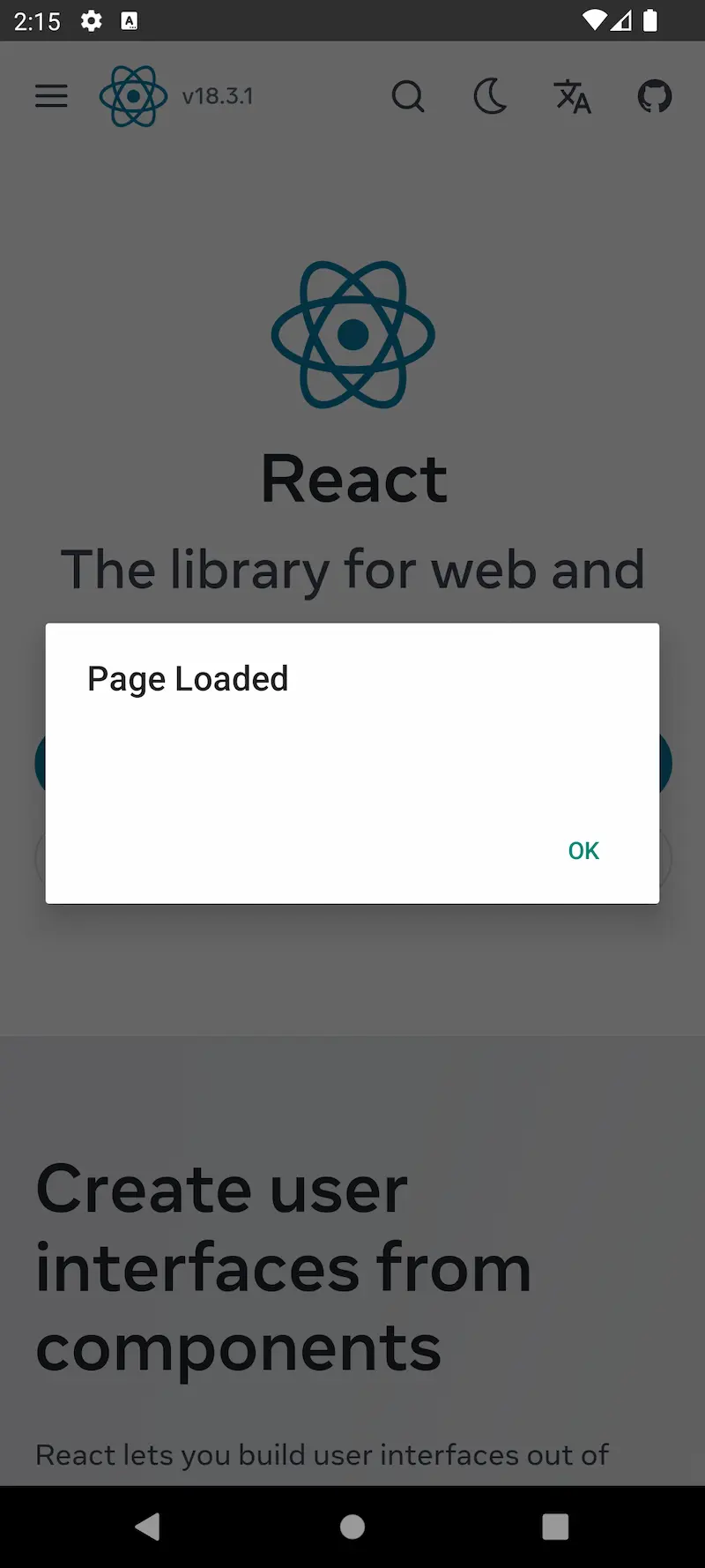 The app also shows an alert when the web page is loaded.